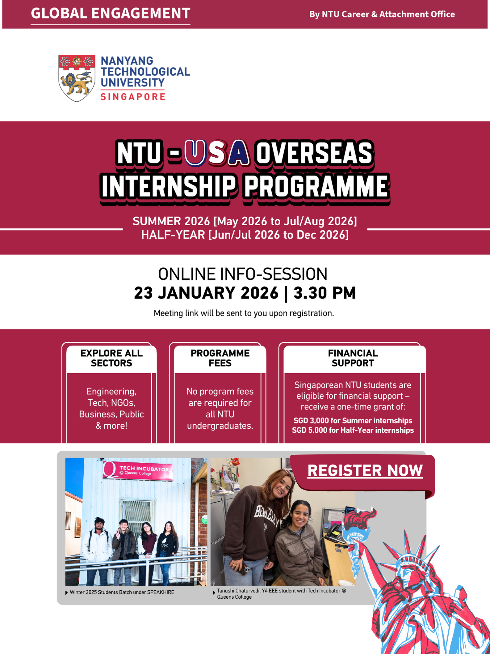 The NTU-USA Overseas Internship Programme is designed to give NTU undergraduates the opportunity to gain valuable industry experience in the United States, while meeting academic and professional goals.